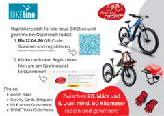 Besonders stolz sind wir auf die Fusion mit der Kampagne „Österreich radelt“. Das Beste daran: Jeder Kilometer, den ihr für die BIKEline sammelt, fließt nun automatisch auch in das System von „Österreich radelt“ ein. Das bedeutet für euch keinen zusätzlichen Aufwand und Gewinnchancen bei der Verlosung von Österreich radelt.